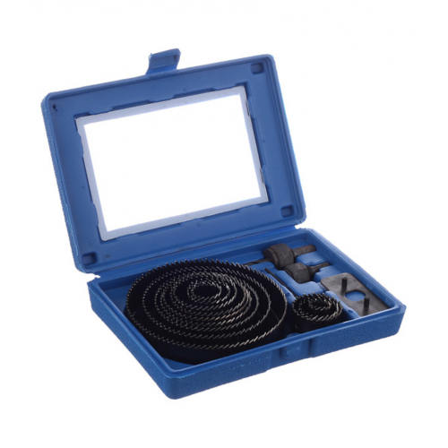 12 коронок разного диаметра, 2 адаптера, ключ, ведущая пластина.