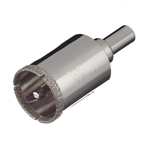 Предназначена для сверления отверстий в керамической, керамогранитной и кафельной плитке при обязательном водяном охлаждении. Равномерное распределение зерна на поверхности рабочей части обеспечивает аккуратное сверление материала без трещин и сколов. В комплект входит центрирующее сверло, которое исключает возможность смещения инструмента во время работы. Материал абразива – синтетические алмазы, зерно 60