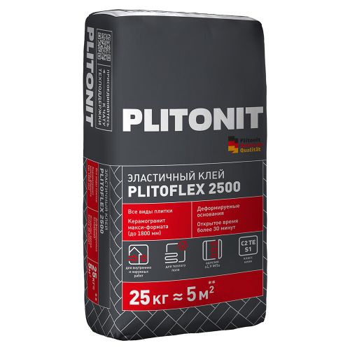 Продукт предназначен для приклеивания любого типа облицовочной керамической, керамогранитной и клинкерной плитки, плитки из натурального и искусственного камня в том числе крупного формата на поверхности стен и полов из бетона, железобетона, ячеистого бетона, кирпича, гипсокартона, цементных, известково-цементных и гипсовых штукатурок, на сложных и деформирующихся основаниях и элементах конструкций, таких как ЦСП, ДСП при проведении внутренних и наружных работ. Эластичные свойства PLITOFLEX 2500 компенсируют возникающие напряжения между плитами и основаниями при их структурных и температурных деформациях, найдя свое применения в том числе на сложных (плитка на плитку, поверх эластичных полимерных гидроизоляционных материалов) и деформирующихся основаниях. Применяется при строительстве и ремонте жилых и общественных зданий и сооружений, в том числе учебно-воспитательных заведениях, детских, дошкольных, школьных и медицинских учреждениях (в т.ч. лечебно-профилактических и санаторно-курортных).