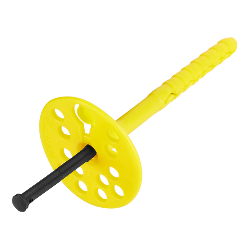 Предназначен для крепления пенопласта толщиной до 50 мм к бетону, полнотелому кирпичу, природному камню, силикатному кирпичу на цоколе или вентилируемом фасаде, а также на фасадах под штукатурку. За счет широкой шляпки дюбель часто называют "парашют" или тарельчатый дюбель. Конструкция широкой шляпки дюбеля плотно прижимает теплоизоляцию, отверстия позволяют утопить дюбель в клее без потери эластичности шляпки, нейлон обеспечивает надежное сцепление с материалом основания. В комплекте с дюбелем поставляется нейлоновый гвоздь, который для большей прочности армирован стекловолокном.