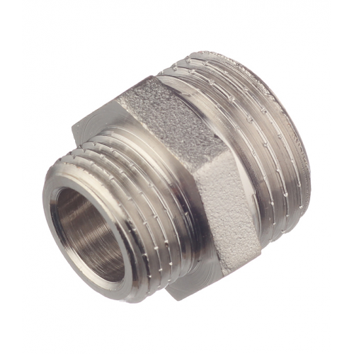 Предназначен для соединения элементов трубопровода разного диаметра. Выполнен из латуни CW617N (евростандарт EN12165) горячим штампованием с последующим никелированием. Резьба обоих патрубков – наружная (тип – цилиндрическая трубная, ГОСТ 6357, ISO 228, EN10226). Насечки на резьбе способствуют удержанию герметизирующего материала (например, сантехнического льна). Наличие шестигранного (под гаечный ключ) участка корпуса облегчает монтаж соединения. Имеет один выход с наружной резьбой 1/2" (16 мм) и другой с наружной резьбой 3/8" (10 мм).