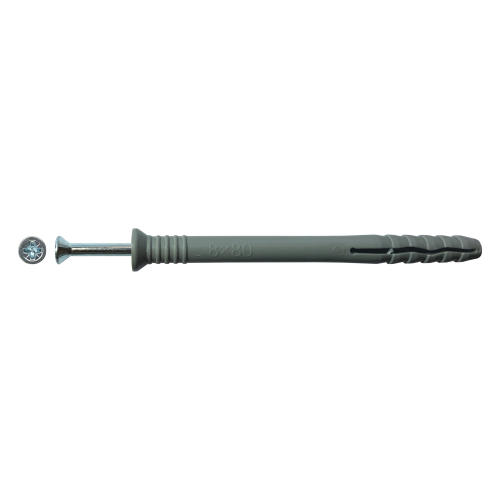 Предназначен для крепления в бетон, керамический полнотелый кирпич, ячеистый бетон, клинкерный кирпич и натуральный камень. Поставляется в комплекте со стальным гвоздеобразным шурупом (крестообразным шлицом), шлиц которого позволяет демонтировать закрепляемую деталь без нарушения внешнего вида крепления.